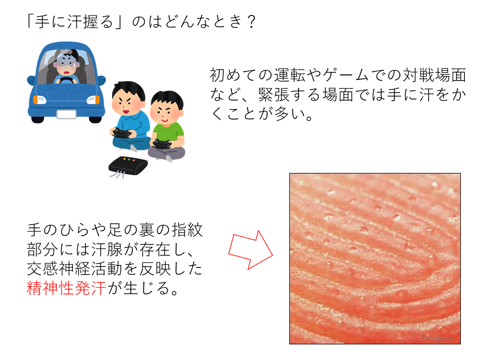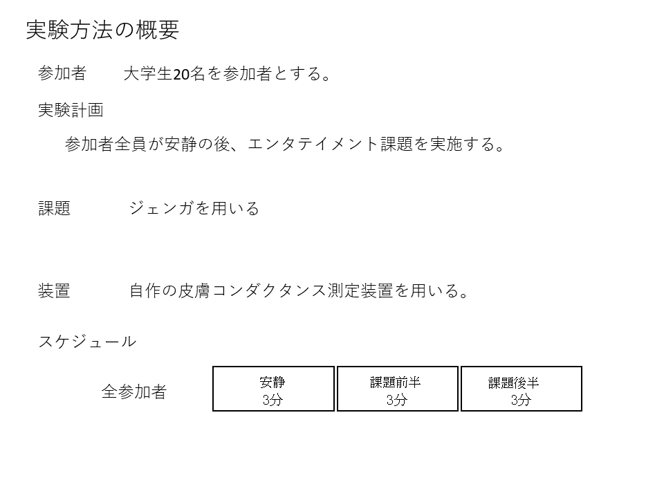 「手に汗握る試合」という言葉がありますが,実際にあのときの汗はどこから出ているのでしょうか。スポーツやゲームで緊張したり,ドキドキしたりする瞬間,私たちの体は正直に反応しています。このような“心と体のつながり”を科学的に確かめるのが,生理心理学の面白いところです。心の動きを数値としてとらえることで,ストレスや集中,楽しさといった目に見えない心理状態を客観的に見ることができます。今回の演習では,その代表的な生理反応である皮膚コンダクタンス(発汗によって変化する皮膚の電気の通りやすさ)を測定します。エンタテイメント課題としてジェンガを行い,手のひらの発汗がどのように変化するのかを調べることで,「楽しい」「緊張する」といった感情の裏側にある自律神経の働きを実感的に理解することを目的としています。